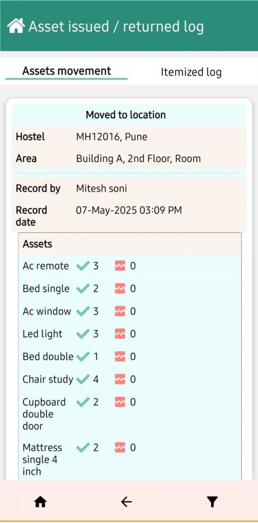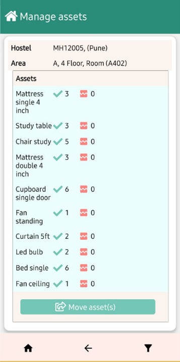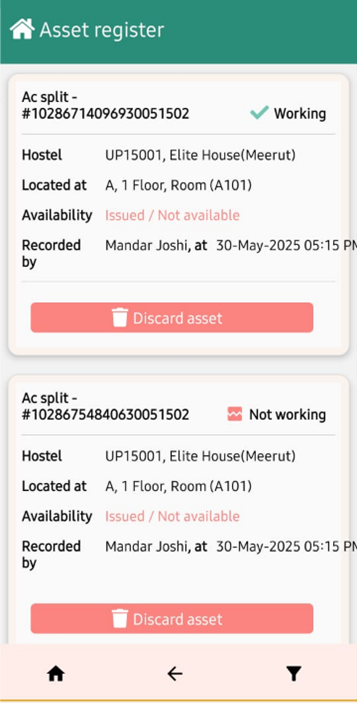 Every asset — from AC units and appliances to furniture and infrastructure — is digitally registered within the platform, tagged to its exact location (hostel, floor, room). Real-time status indicators allow teams to track whether assets are working, issued, under maintenance, or unavailable.