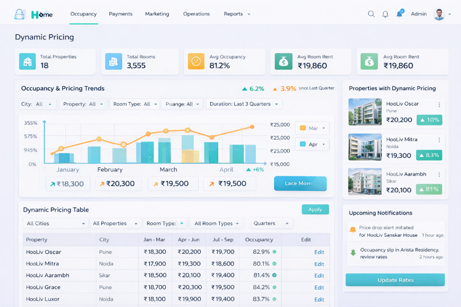 Beyond conversational AI, intelligence is deeply embedded into HooLiv’s pricing and decision systems. Using machine learning models built on historical occupancy, seasonality, demand patterns, and property-level performance, HooLiv dynamically optimizes pricing and inventory allocation. These models are visualized through real-time dashboards, enabling leadership teams to balance affordability, occupancy, and revenue efficiency across cities and institutions.