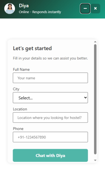 At the front of this experience is Diya, HooLiv’s AI-powered assistant embedded on our website. Diya acts as the first point of interaction for prospective residents and parents, instantly responding to queries related to availability, room types, pricing, facilities, site visits, bookings, parental concerns, and general brand questions. Instead of static forms or delayed callbacks, users receive contextual guidance in real time — improving conversion while reducing operational load on sales teams.